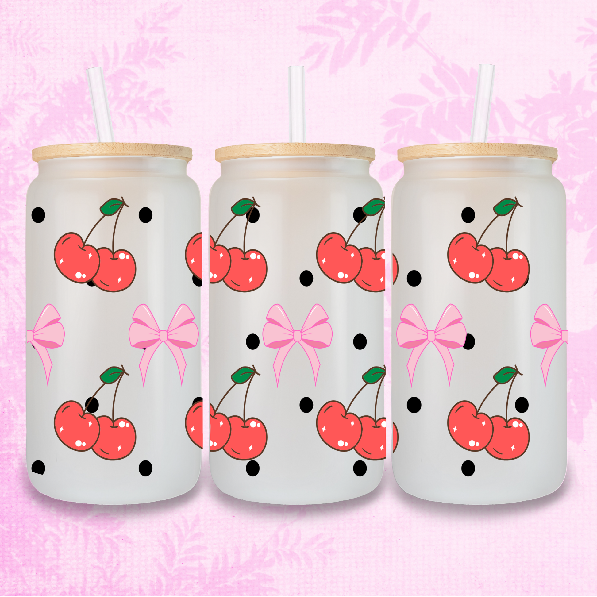 Coquette Cherries & Bows 16oz Frosted or Clear Libbey Glass Can with Bamboo lid & Straw