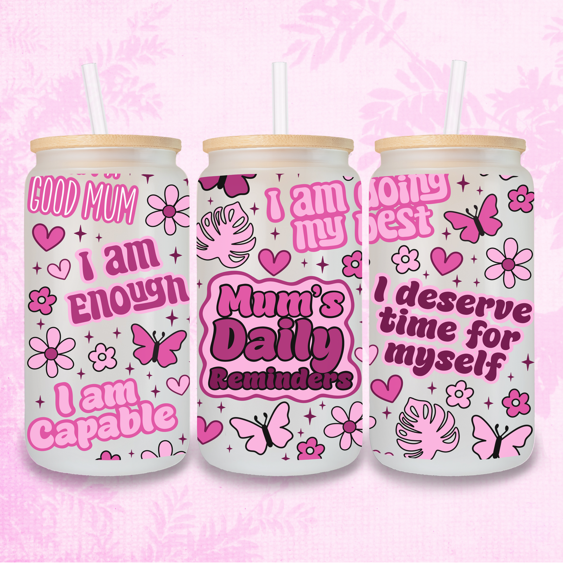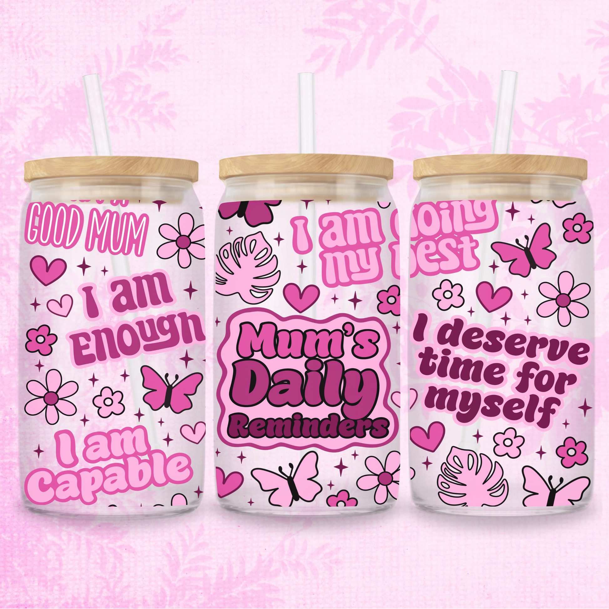 This Mums Daily Reminders 16oz Frosted or Clear Libbey Glass Can is a must-have accessory.